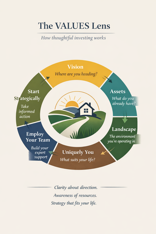 A calm, structured space to assess what you already have, what you want next and how property and investing might support the next phase of your life.